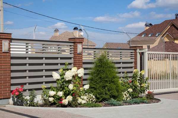 Очень красивы открытые ограды на кирпичном основании. Между кирпичными столбиками монтируются пролеты из штакетника или кованых решеток. Высота цоколя делается по желанию, и бывает от полуметра до половины общей высоты забора.