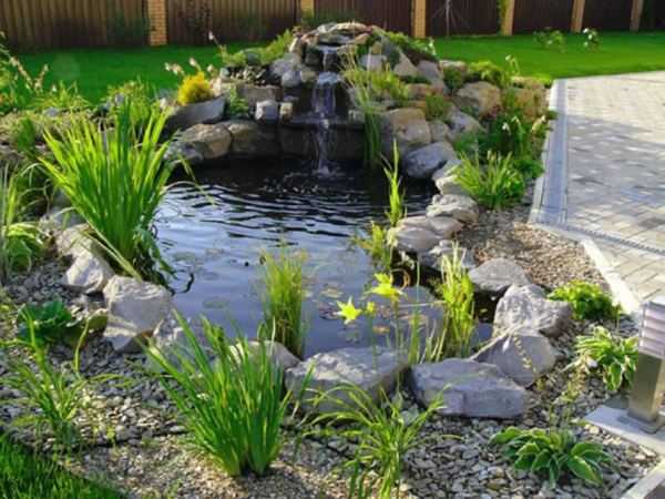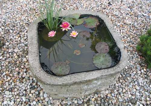 При дефиците площади создается миниатюрный водоем из пластиковой емкости. Ванна, большой таз или другой подходящий сосуд вкапывается в почву, обкладывается галькой и наполняется водой. Картинку дополнят садовые фигурки лягушат, уток и прочей живности, обитающей возле воды.