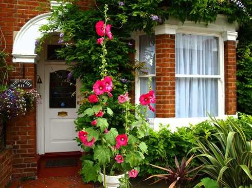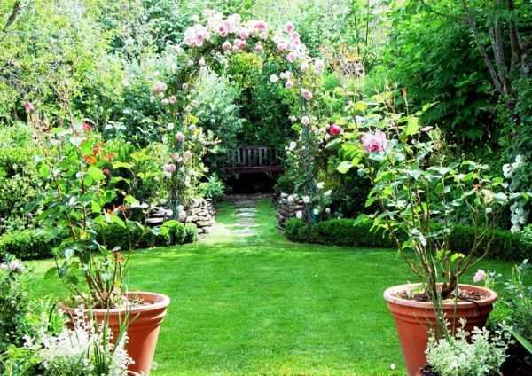 Стены передней части жилища можно украсить вьющимися растениями: глицинией, кампсисом и жимолостью. Такая «живая» стенка станет отличным фоном для других цветов. Возле входа в здание также можно поместить растения в подвесных горшках. Для этих целей прекрасно подойдут лаванда и гортензия. Возле входа на приусадебный участок в деревне очень красиво будет смотреться арка из роз. Она будет не только украшать территорию своим красивым видом, но и будет источать ни с чем несравнимый аромат.