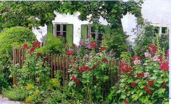 Палисадник романтического стиляДля деревенского стиля характерны травянистые многолетние растения, такие как мальва и шалфей. При этом хорошо смотрится живая изгородь или невысокий деревянный штакетник. У стены дома можно поставить столик со стульями.