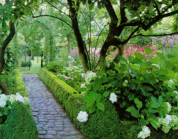 Палисадник деревенского стиляСовременный стиль предполагает украшение стрижеными деревьями и кустарниками. Среди них самшит, тис, бирючина. В качестве покрытия можно использовать натуральный камень.