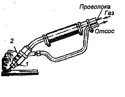 При работе сварочных тракторов на нестационарных местах щелевые и воронкообразные пылегазопрнемники монтируют на сварочной головке непосредственно около электрода. Всасывающее отверстие располагается над слоем флюса на высоте 40—50 мм, что исключает засасывание флюса в приемник.