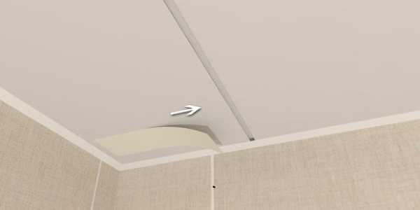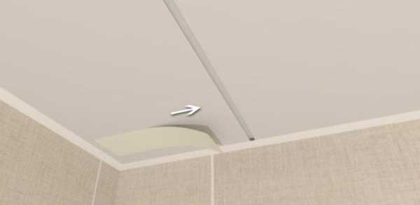 Затем монтировать в потолок так, чтобы отрезанная сторона соприкасалась со стеновой поверхностью. Возможные дефекты скроет финишная отделка потолка плинтусами.
