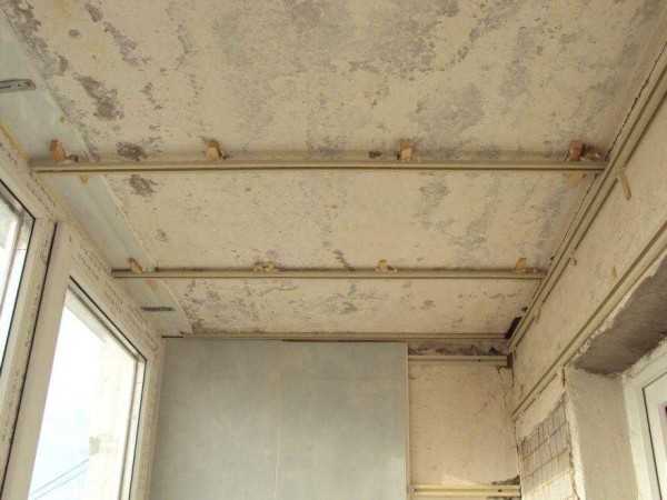 Поперек потолочной поверхности крепятся бруски с шагом 30-40 см друг от друга. Чтобы работать было удобнее, можно предварительно нанести разметку. Тогда устанавливая бруски, можно будет сразу выравнивать их. Процесс пройдет быстрее, если вдоль помещения натянуть нити между брусками, создающими общий контур. Тогда располагать и крепить детали будет проще.