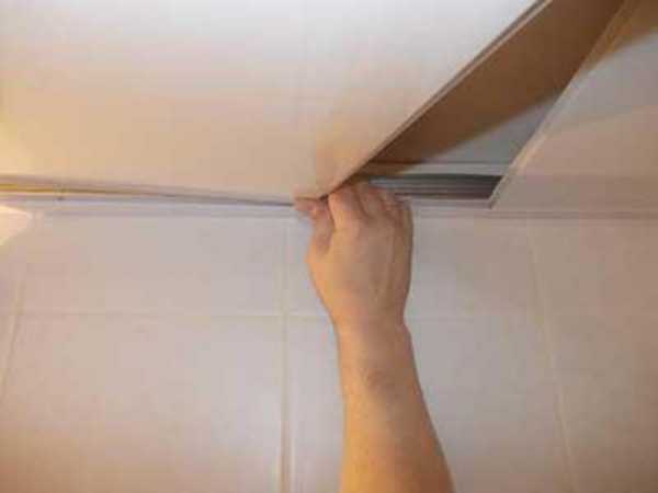 - Сперва, необходимо вставить боковые стороны панели, для чего, она немного выгибается. Не стоит слишком с этим усердствовать – можно сломать планку. Сначала вставляется одна сторона до упора, а потом, когда вторая сторона окажется вставленной в профиль на противоположной стене, она выдвигается для более надежной фиксации.