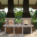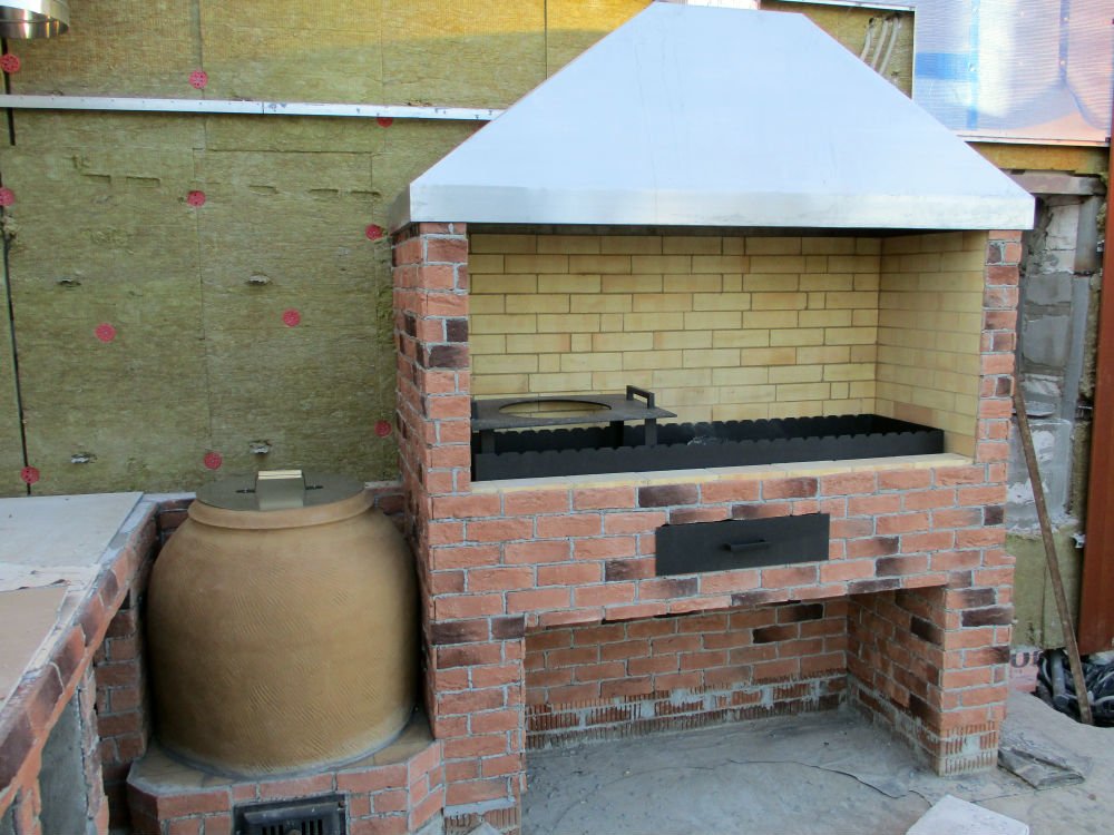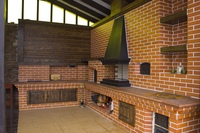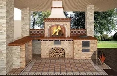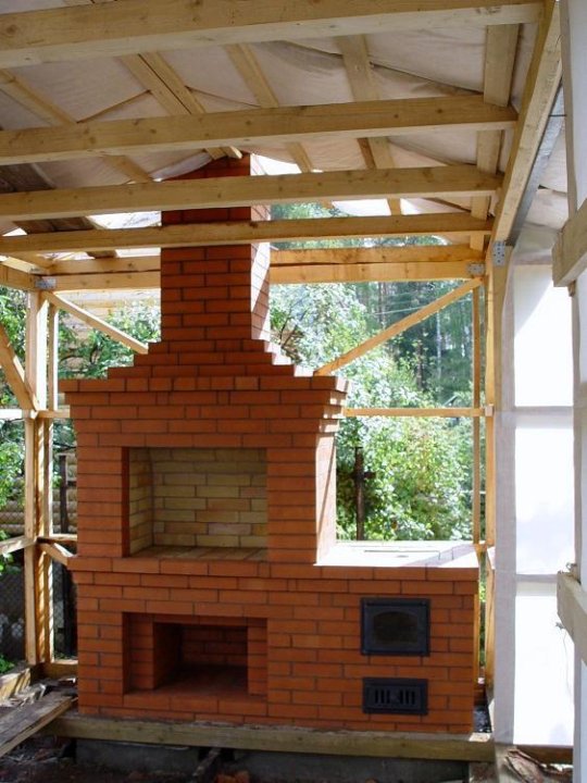 По внешнему виду подобные барбекю похожи на мангал английского образца. У них открытая топка, а уловитель дыма по форме близок к призме. Использовав такую печь в качестве комплексного барбекю под одной крышей со столом и другой мебелью, придется топить ее древесным углем. Сжигание обычных дров создает температуру около +300 градусов, которая может вывести из строя самые чувствительные части конструкции.