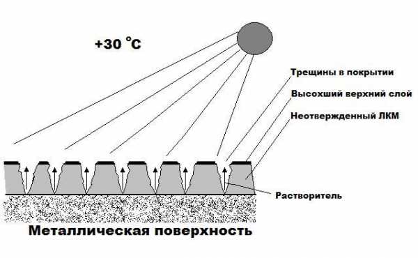 Растворитель улетучился, покрытие высохло, но целостность его была нарушена. В местах отсутствия контакта с солнечными лучами режим сушки был более щадящим (тоньше слой покрытия, ниже температура), и целостность покрытия не была нарушена. Вывод – опять же наносить материал более тонким слоем (с разбавлением до рабочей вязкости растворителем), а в случае необходимости получения толстослойного покрытия, наносить ЛКМ в несколько слоев с обязательной межслойной сушкой.
