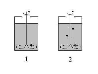 Вообще, проблемы с ЛКМ могут возникнуть там, где их и не ожидаешь, например, при подготовке материала к окраске. Пример – клиент приобрел эпоксидную грунтовку с высоким сухим остатком и, как это часто бывает в таких случаях, проявляющую свойство тиксотропии (способность понижать вязкость и проявлять текучесть при приложении внешних сдвиговых усилий – например, при перемешивании). Проводит входной контроль, и заявляет, что грунтовка жидкая, не соответствует требованиям ТУ по показателю «условная вязкость». Проверяем арбитражную пробу – все в порядке, вязкость в норме. Интересуемся у потребителя, перемешивал ли он грунтовку перед проверкой – ответ «да, механической ручной мешалкой». Делать нечего, надо ехать. Приезжаем на предприятие, нам предъявляют барабан с грунтовкой, показывают ту самую «механическую ручную мешалку». Оказывается, это обыкновенный тихоходный шуруповерт с насадкой длинной в 30 — 35 см. А высота барабана с продукцией – минимум полметра, т.е. эта мешалка погружается в лучшем случае до середины барабана и уж точно никаким образом не перемешивает продукцию в таре по всему объему. Поскольку грунтовка с высоким сухим остатком, естественно произошло частичное расслоение, и пигментная фаза с частью связующего опустилась ниже, и в приповерхностном слое вязкость (и сухой остаток) уменьшились. При этом на дне тары никакого осадка нет. Благо привез с собой нормальную механическую мешалку с насадкой требуемой длины, и после правильного перемешивания проверка показала полное соответствие значения условной вязкости заявленному в паспорте качества. Проблема – в отсутствии умения правильно перемешивать ЛКМ в таре. Сначала надо вращательными тщательно перемешать придонный слой, особенно в случае образования пигментного осадка на дне тары, а затем, не прекращая вращения, возвратно поступательными движениями (вверх-вниз) перемешать содержимое тары по всему ее объему (Рис. 3).
