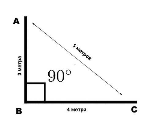 Если между точками A и C установить расстояние ровно 5м, то угол, который выходит из точки B, получится прямым и будет иметь ровно 90⁰.