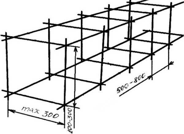 - Если высота ленты у нас получится 1,1м, то каркас будет достаточным 0,85м, тогда для вертикальных перемычек используем арматуру (гладкостенную или рифлёную) сечением 10 мм и длиной 0,9м (5 см на запас). На горизонтальные перемычки используем такую же арматуру по 0,35м длиной, тогда на одно кольцо у нас уйдёт 90*2+35*2=2,5м, а при шаге колец 0,5м мы получим 48,6/0,5*2,5=243м или 243/6=40,5 или 41 штука.