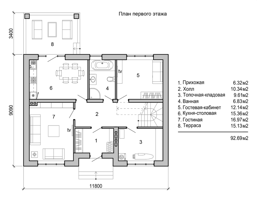 | Всего | 98,4 кв. Широкий портал принимает посетителя (или жителя), чтобы дать доступ к пространству комнаты. В данном случае это просторная гостиная, независимые от столовой и кухни. В задней части дома расположены кухня и столовая, соединенные дверным проемом, так что они наполовину отделены друг от друга. Из кухни можно выйти на террасу в качестве служебного дворика. На первом этаже есть половина ванной и спальня или кабинет. Прямая лестница ведет на верхний этаж, где расположены 3 спальни и 2 полноценные ванные комнаты. Главная спальня имеет собственную ванную комнату. Во второй комнате есть гардеробная, а за счет свободного места можно было бы разместить еще одну ванную комнату внутри. Из центрального холла можно выйти на очень просторный балкон с крытой площадью 25м2.