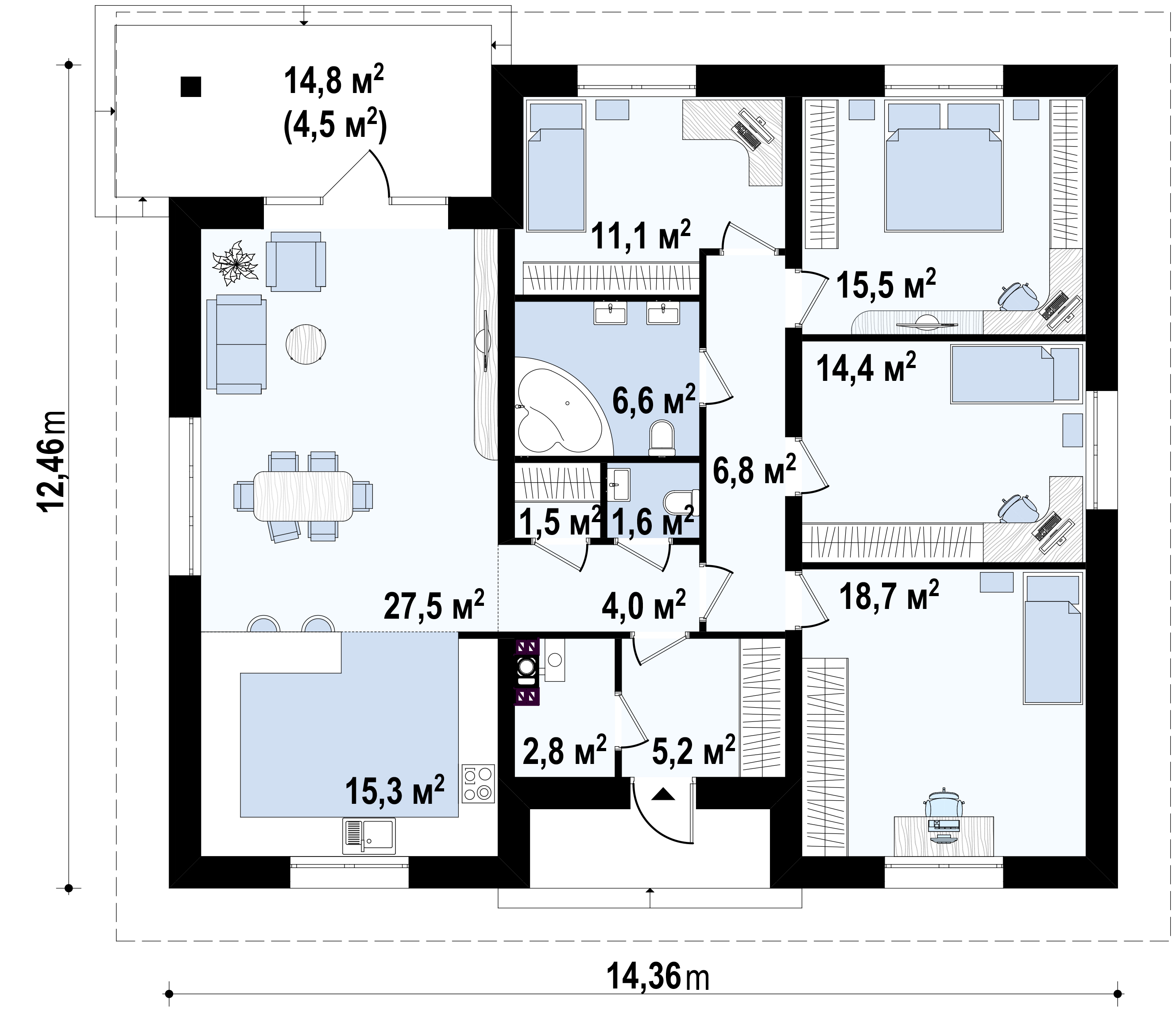 Важным бонусом проекта выступает присутствие в планировке просторной кухни-столовой (17,6 кв. м).