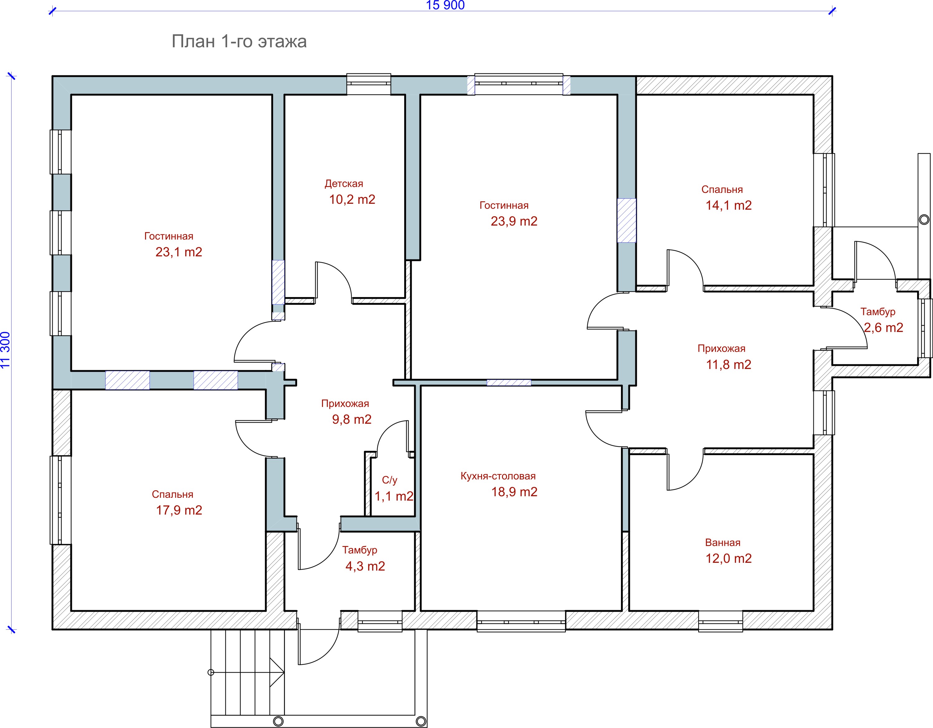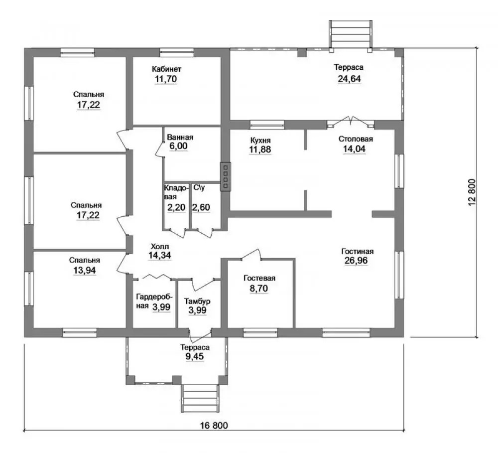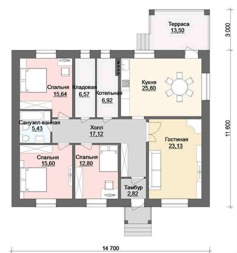 Типичный пример – проект №58-01. Коттедж высотой в один этаж обладает большой площадью (197,08 кв. м) Она позволяет разместить не только три просторных спальни (от 15,3 до 18,5 кв. м), но и, благодаря грамотной планировке, отделить зону отдыха от гостиной и кухни-столовой обширным холлом (23,7 кв. м.)