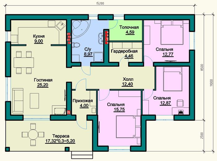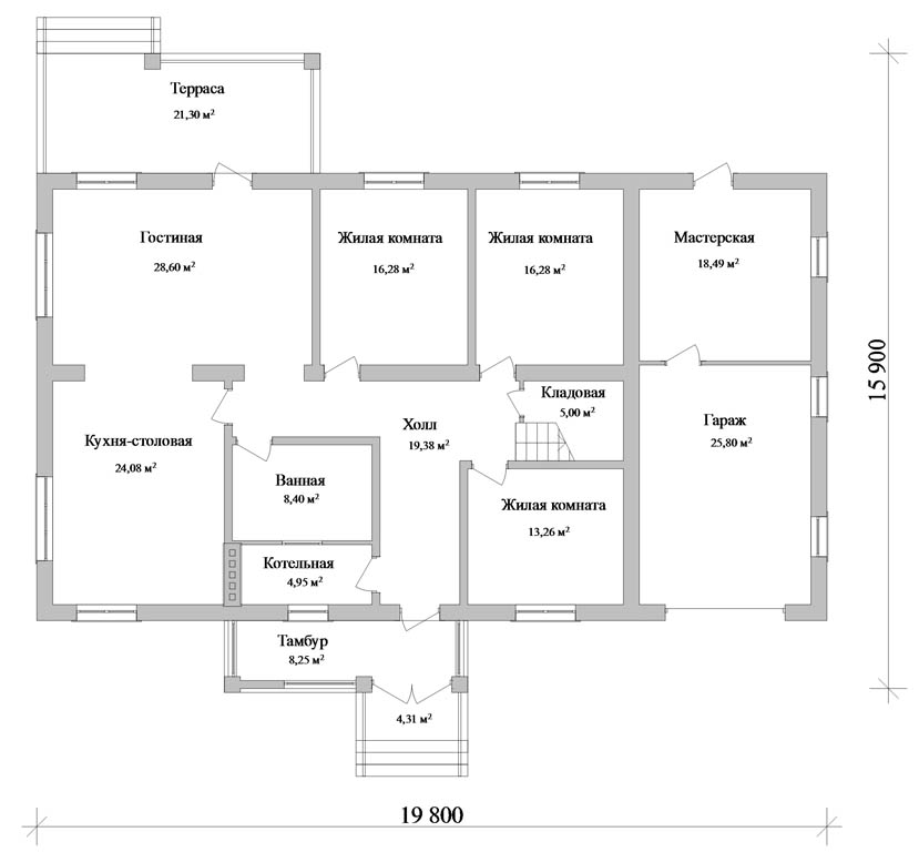 В оставшуюся площадь удалось вместить котельную, санузел, тамбур или предбанник и холл.