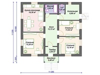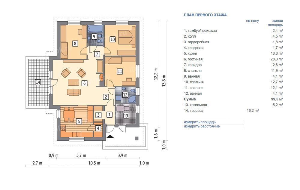 Посмотрите сами на предложенный проект. В нем есть три спальни по 11,9; 12,2 и 12,5 кв.м и гостиная 20,2 кв.м. Помещение между комнатами – это кухня, выполняющая и роль столовой площадью 13,1 кв.м. Туалетная комната совмещенная, расположена рядом со входом в дом.