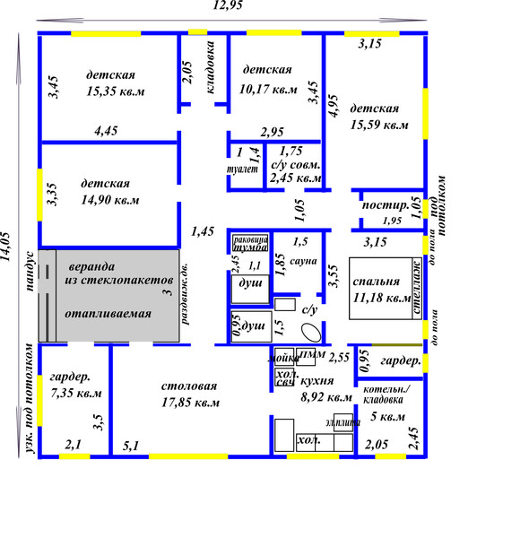 Если вам не нужно 2 детских комнаты, одно помещение можно отвести под кабинет или гостевую комнату. Если дом обогревается двухконтурным котлом и котельная не нужна, санузел можно сделать раздельным или использовать высвободившуюся площадь под гардероб, кладовую, сушилку.