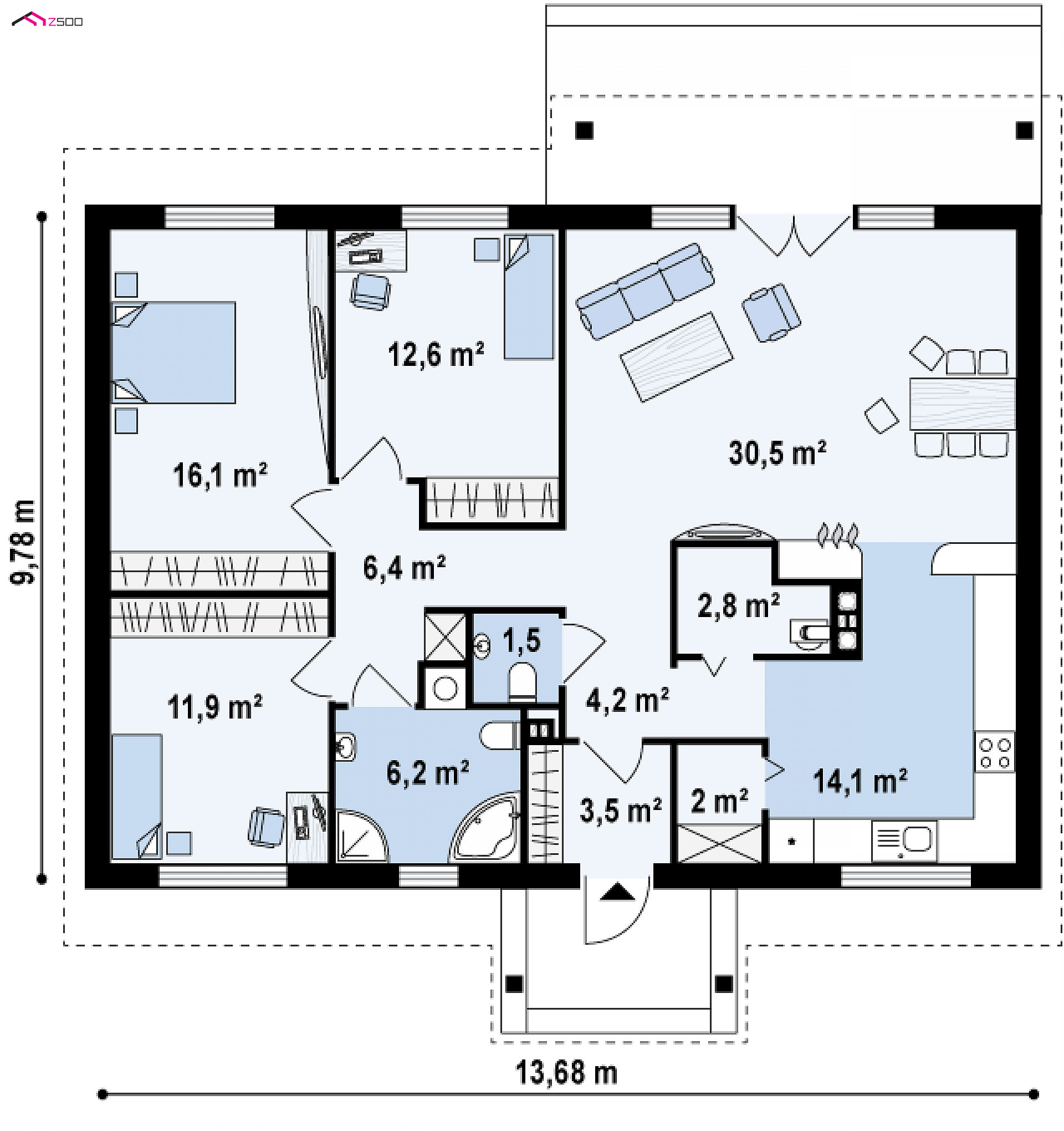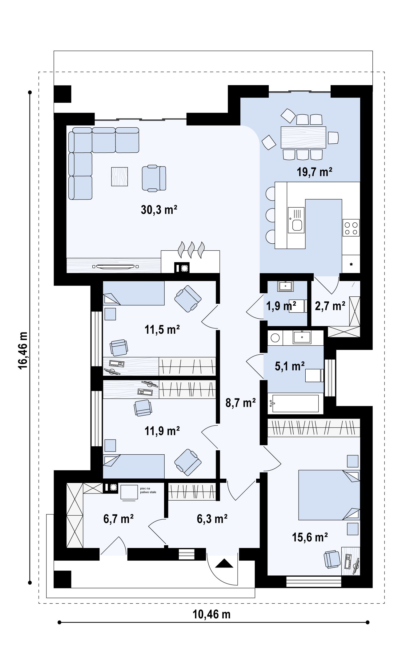 Размещение в одноэтажном доме трех спален реально осуществить даже в проекте постройки маленькой площади. Образец подобного решения – проект №59-61 общей площадью всего 102 кв. м. Три спальные комнаты разделены просторной гостиной (20,6 кв. м.), в которой могут комфортно разместиться обитатели дома. Важная особенность плана здания – одна спальня располагается от двух других отдельно. Это делается для размещения там семьи с маленьким ребенком, чтобы его плач или беспокойство не мешали спать остальным. Или напротив, для отдыха пожилых людей подальше от беспокойной и шумной молодежи.