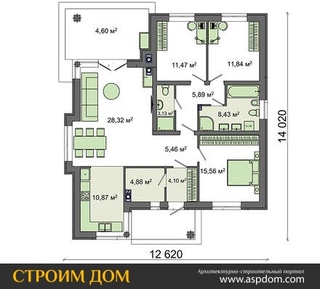 Одноэтажный дом с тремя спальнями и террасой, планировка дома 3 комнаты