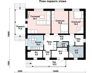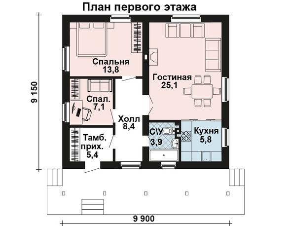 Площадь дома выступает за квадратуру 10×10 на 2,3 метра. Этими помещениями можно пожертвовать, если размеры участка не позволяют их оставить. А вход сделать с улицы прямо в холл, отгородив его, к примеру, гипсокартонной стеной с дверью.