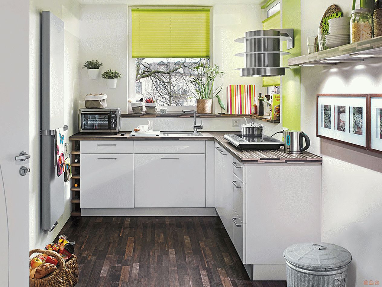 Очень маленькую кухню желательно оформлять в светлых тонах. Это, конечно, не добавить ей площади, но позволит увеличить визуально.
