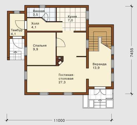 План 1 этажа деревянного дома с верандой размером 11х8