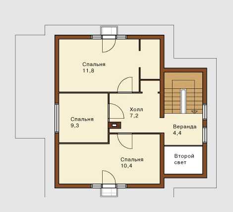 - И на первом, и на втором этажах лестница выходит в просторный холл. В него же открываются двери всех комнат.