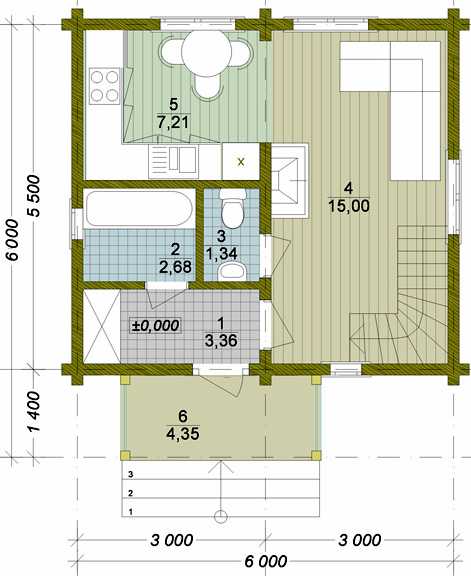 Пример планировки крыльца деревянного домаВходная группа, как правило, включает в себя тамбур, состоящий из гардеробной и прихожей. Тамбур необходим для того, чтобы дверь с улицы не открывалась напрямую в жилое помещение, во избежание попадания холодного или жаркого уличного воздуха. Хорошая внутренняя планировка деревянного дома в обязательном порядке подразумевает его наличие.