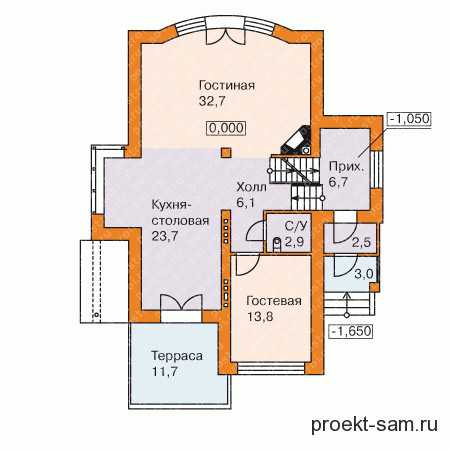 | Цокольный | Сауна, санузел, кладовка для хранения продуктов (постоянная круглогодичная прохлада), котельная и небольшой холл |