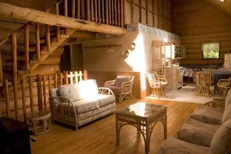 Оригинальная лестница на второй этажСам дом можно дополнить небольшой мансардой, размеры которой составляют примерно 8х8 м. Традиционно проекты деревянных домов из бревна с мансардой подразумевают обустройство на первом этаже гостиной, кухни-столовой и холла, которые образуют собой единое, гармоничное пространство. Кроме этого, на первом этаже отводят место под санузел с душевой кабиной и спальней для престарелых родителей. Если со стороны гостиной обустроить дополнительный вход в дом, то обустройство тамбура не требуется (так как этот вход используется только в летнее время года). Через него же можно попасть в общую зону, включающую в себя кухню-столовую и, соответственно, гостиную, которую можно дополнить камином.