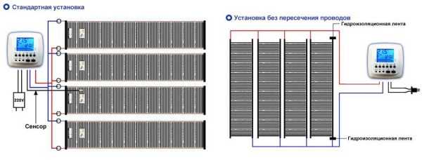 Две схемы подключения пленочного теплого пола (кликните для увеличения размера)