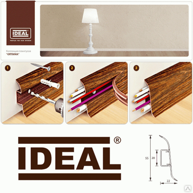 Длины стандартного плинтуса достаточно, чтобы установить несколько планок в помещении. Если обрамление не имеет скрытый кабель-канал, тогда необходимо штробить стены под закладку проводов, и только после этого монтировать обрамление.