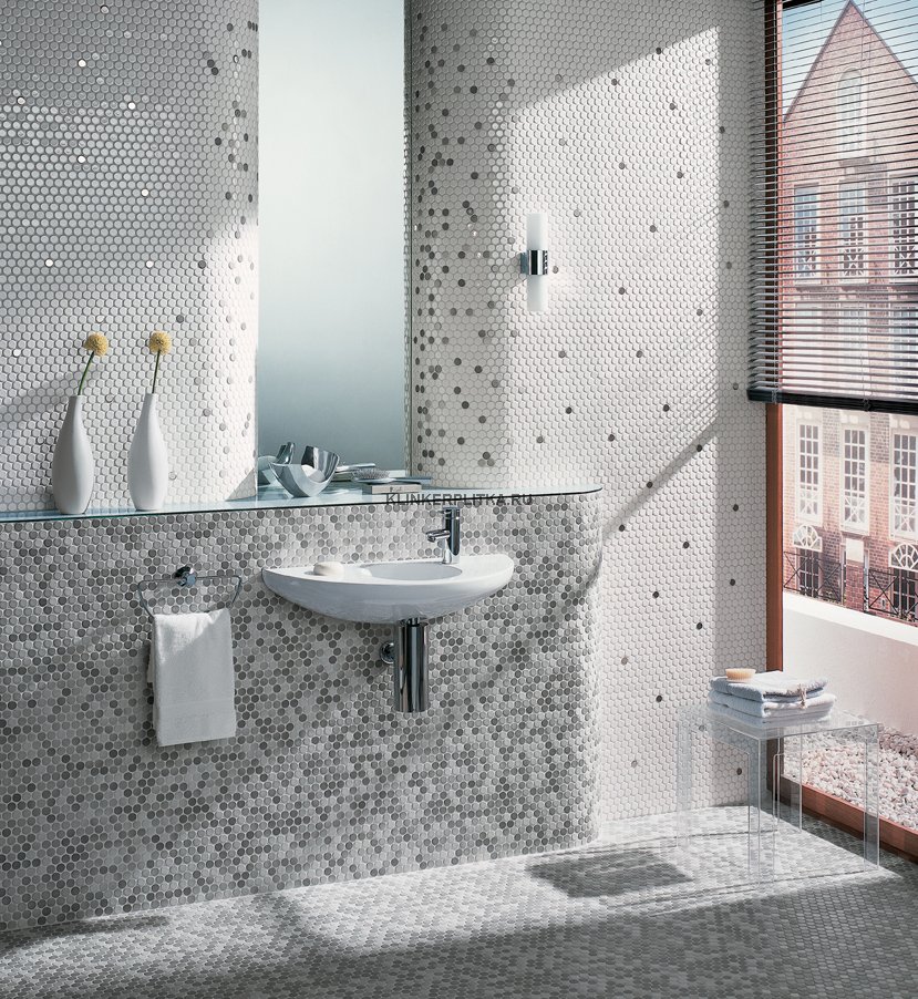 Мозаика открывает широкие возможности в оформлении ванной комнаты. Плавный переход от темно-серого цвета к белому с помощью шестигранной плитки мелкого формата создаст эффектную имитацию ниспадающих капель дождя.
