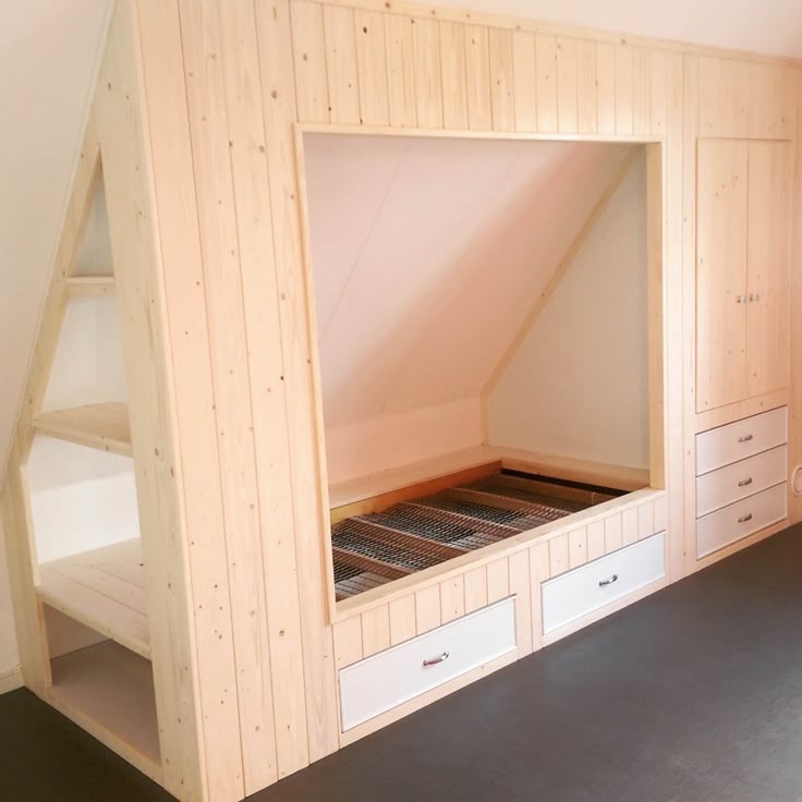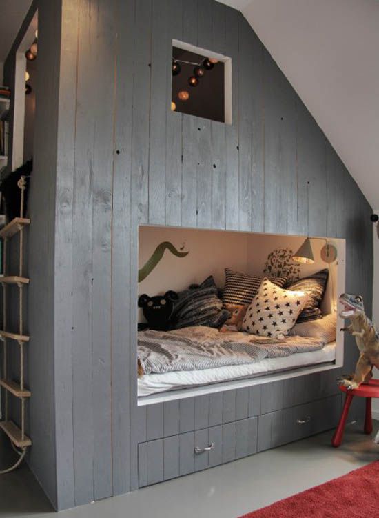 Помимо представленных вариантов, есть еще несколько решений для добавления места для хранения в кровать. Более необычным вариантом является встраивание кровати в большую стенку. Вы можете создать угловой уголок с удобным матрасом и несколькими полками. Под ним может быть место для хранения, а остальная часть стены может быть одним большим хранилищем. Эту идею можно использовать, если, например, вы хотите создать в комнате уютный уголок для чтения, а не настоящую спальную зону. {Найдено на irarquitectura}.