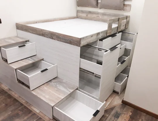В большинстве случаев такой дизайн трудно найти или он очень дорогой. Не беспокойтесь, потому что всегда есть решения. Например, вы можете построить собственную кровать-платформу с большим количеством встроенных мест для хранения вещей, переделав несколько простых кухонных шкафов Ikea. Вы можете расположить их разными способами, чтобы получить желаемую комбинацию.