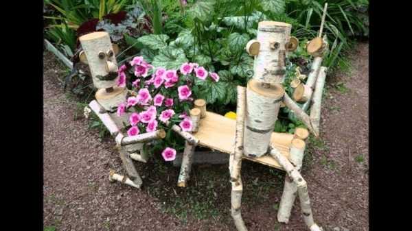 Не менее креативные варианты поделок можно сделать из обычного дерева. Это подручный материал, который найдётся на любой даче. Первое, что приходит на ум – проект столика и лавочек. Заметьте, что не обязательно делать их классическими. Достаточно интересно могут смотреться поделки мебели из пеньков или срубов дерева.