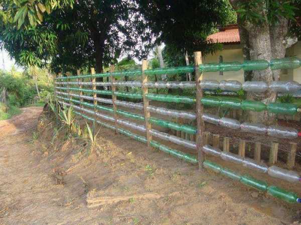 - Забор из пластиковых бутылок. Чтобы отгородиться от соседей или просто что-либо оградить, сделайте заборчик из бутылок. Можно подойти креативно к этому вопросу и дополнительно оформить его краской или другими элементами декора.