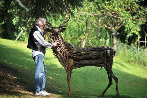 - Натуральные природные материалы наилучшим образом будут гармонировать с естественной средой, не нарушая баланса. Старые ветки и деревья, поленья и спилы – в ход идет все. Воспользовавшись советами мастеров, можно сплести удивительные фигурки животных, как на фото ниже. Большие круглые спилы подходят для тропинки.