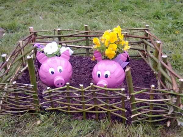 Они могут быть не только декоративными, но и весьма функциональными. Возьмите хотя бы пластиковые бутылки — уже ни для кого не секрет, что из них получается хорошая система капельного полива на небольших участках. А применив к ним технику папье-маше, вы получите гномов и декоративные грибочки, выглядывающие из-под деревьев. Из старых вещей и соломы – огородное чучело, из ивовых прутьев – плетень (забор, который станет настоящей изюминкой) и т. д. Любые поделки для огорода из подручного материала станут его приметной чертой.