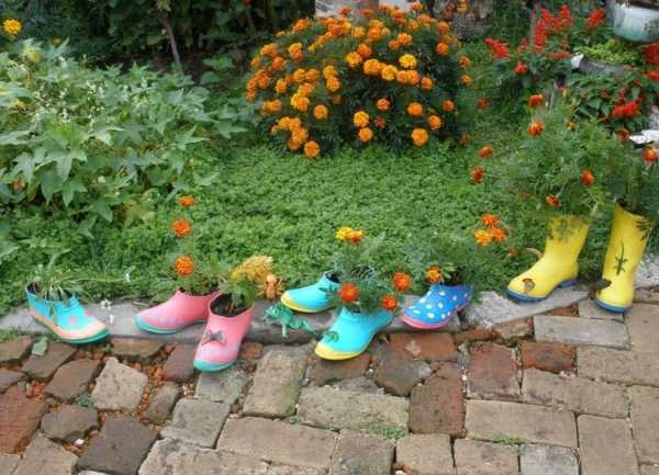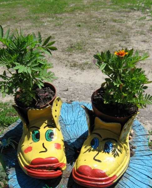 - Обувь. Старые ботинки или дырявые резиновые калоши вряд ли вам пригодятся по своему прямому предназначению, а вот использовать их на клумбах возможно, причем получается очень весело и уместно.