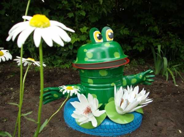 Имея несколько старых шин, можем сделать красивый образ лягушки, которая сидит или выглядывает из газона.