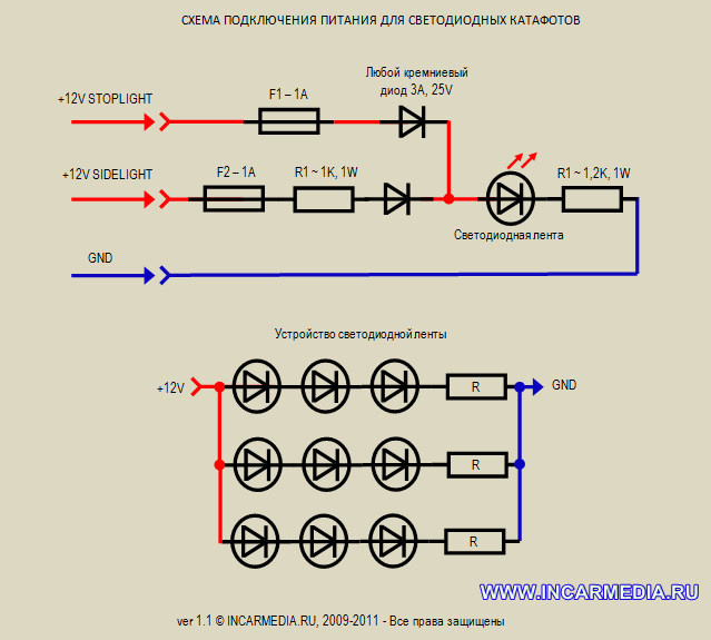 Иногда помогает экранирование металлом и размещение подальше от головного устройства авто. Для белого , синего, зелёного он от 3,2В до 3,4В. Для мощных от 7В до 34В. Эти циферки придется использовать для расчётов. Используя 12V можно полноценно подключить 3 лед диода. Примером служит светодиодная лента на 12V, в которой 3 штуки и резистор подключены последовательно.