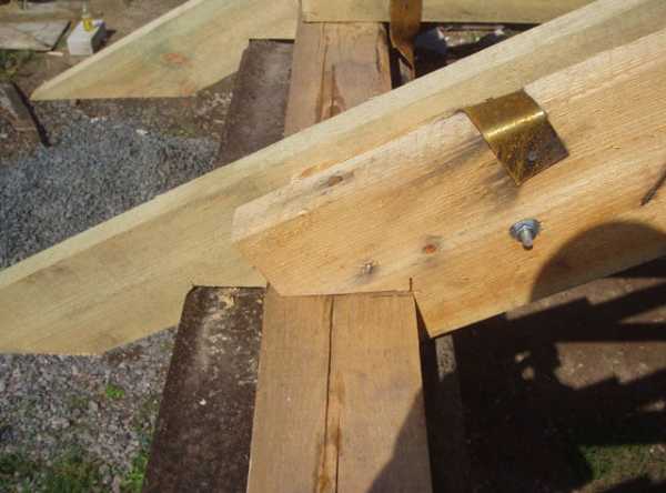 рис. 33. Опирание низа стропил без врубки в мауэрлат с защемлением конькового узла, не дает распора на стеныВо всех трех вариантах соблюдается правило: один конец стропильной ноги делается на скользящей опоре, позволяющей поворот, другой на шарнире, допускающим только поворот. Крепление стропил на ползунах и неподвижных шарнирах делаются самых разных конструкций. Сейчас их часто выполняют на крепежных пластинах. Можно крепить и по старинке: скобами, гвоздевым боем или использованием коротышей брусков и досок. Нужно только правильно подобрать вид крепежа, чтобы он допускал или препятствовал скольжению стропила в опоре.