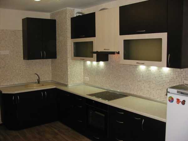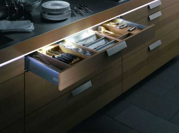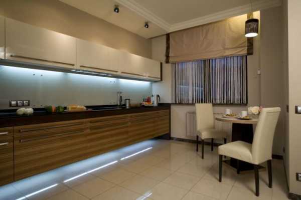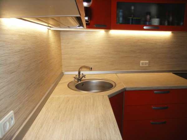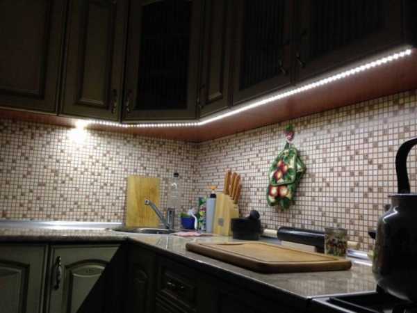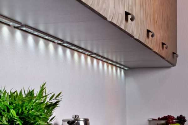 Подсветку рабочей поверхности устраивают под навесными шкафами. Существует несколько вариантов ее организации: