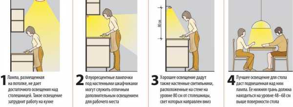Выбирая освещение, нужно учитывать общий свет на кухне, при подсветке освещенность должна быть:
