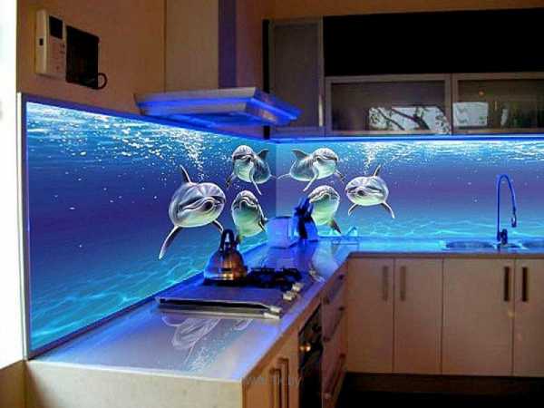 Расположение внутренних светильников, делает всю поверхность равномерно освещённой. Такие панели становятся очень популярными, но они довольно дороги и устанавливаются специалистами. Установив такую панель вдоль рабочей зоны кухни, вы получите необычный и изысканный интерьер.