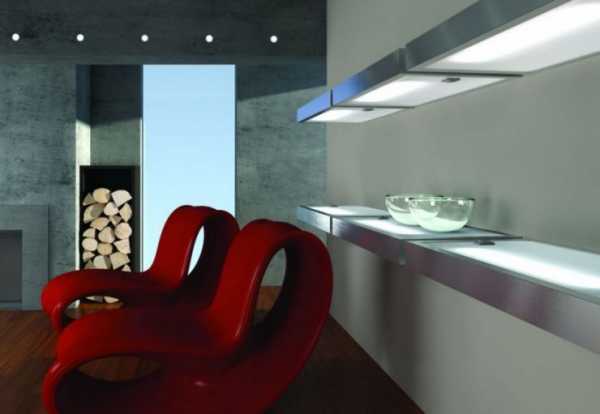 - Встроенные светильники. Они встраиваются в предмет мебели, и они становятся незаметны. Единственный минус, это планировка установки и дополнительные работы, такие как сверление в мебели отверстия под светильник.