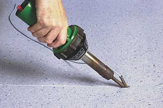 - Стыки между полос склеиваются с использованием холодной и горячей сварки. Горячая сварка требует определённого опыта и специального оборудования — строительного фена со специальной насадкой и шнуром из легкоплавкого полимера. При нагревании полимер заполняет шов между листами линолеума, надёжно их скрепляя. Домашние мастера ввиду простоты и высокой надёжности чаще используют холодную сварку, представляющую собой клеевой состав. С её помощью можно склеить листы линолеума двумя способами. Если линолеум не прикреплён к полу и рисунок позволяет частично наложить их друг на друга, производится подрезка сразу двух полотен. Таким образом получается идеально состыкованный шов без зазоров. Во втором случае полотнища просто сдвигаются и производится склеивание. Перед введением клеевого состава на шов наклеивается малярный скотч, разрезаемый по шву. Затем в шов вводится клей в таком количестве, чтобы состав выступал над поверхностью шва. После высыхания малярный скотч снимается.