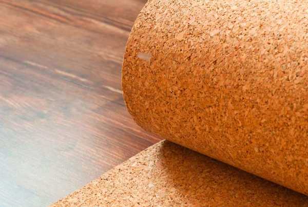 - Пробковая подложка подойдёт для линолеума гораздо лучше. Её положительным свойством является способность скрадывать мелкие неровности, она хороший звуко- и теплоизолятор. Однако есть и отрицательные моменты — такое покрытие ощутимо пружинит, что влечёт ускоренный износ линолеума. Кроме этого, мебель, установленная на такое покрытие, будет «гулять». Стоимость такого материала довольно высока, поэтому цена подложки может превысить цену линолеума.