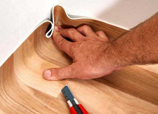 Далее линолеум требуется раскроить под размеры помещения, при этом между стеной и линолеумом необходимо оставить зазор не менее 10 мм, который потом можно закрыть плинтусом. Это расстояние оставляют для того, чтобы при вытягивании линолеума в процессе эксплуатации, края материала не уперлись в стену, иначе это может привести к вспучиванию покрытия.