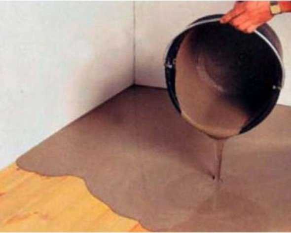 - Использование самовыравнивающей смеси решает проблему неровностей пола. Следует выбирать смеси, специально предназначенные для заливки деревянных полов. Смесь разводится в соответствии с инструкцией изготовителя, после чего ею заливается вся поверхность пола. В результате получается идеально гладкая поверхность, на которую можно стелить любой линолеум. К недостаткам можно отнести то, что при использовании смеси образуется «каменная» поверхность, лишённая всех достоинств деревянного пола. На таком основании также целесообразно использовать подложку для тепло- и гидроизоляции.